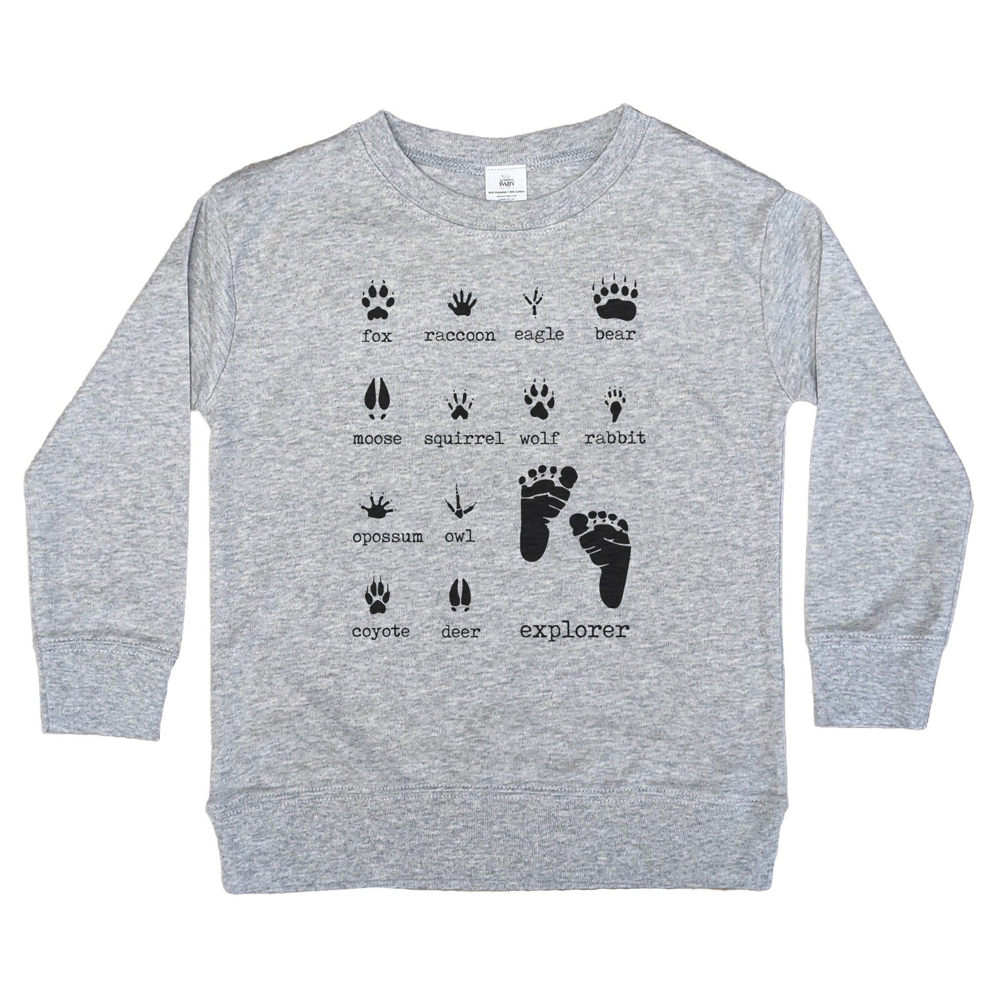"Explorer" Woodland animal Paw Prints Long Sleeve Grey shirt