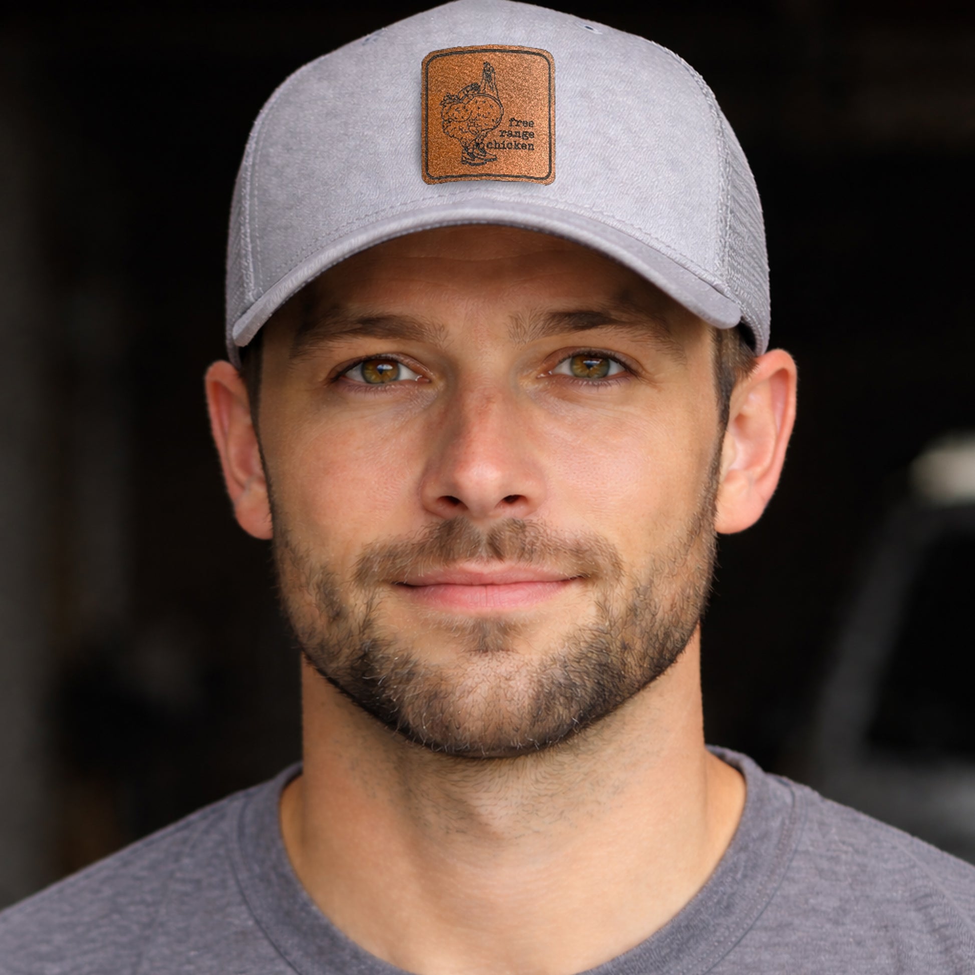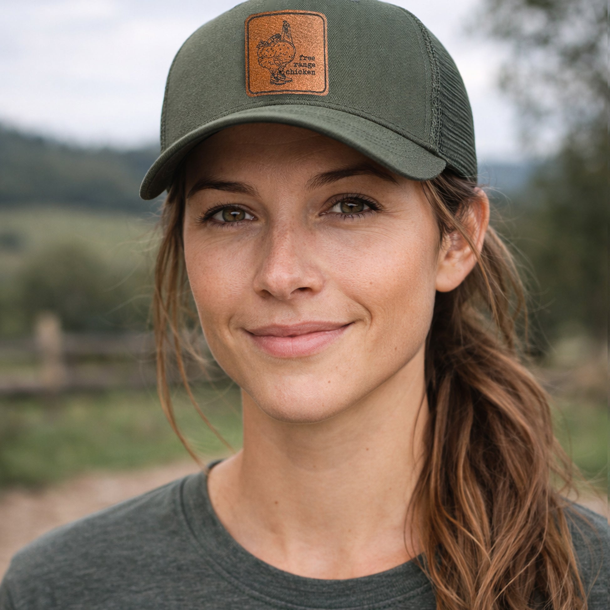 Our "Free Range Chicken” Trucker Hat features the wording on a vegan leather patch—a fun, easy-selling style for outdoor stores, hiking boutiques, and gift shoppers who love nature and the outdoor life. A great add-on for spring and summer, travel displays, and adventure-themed collections.