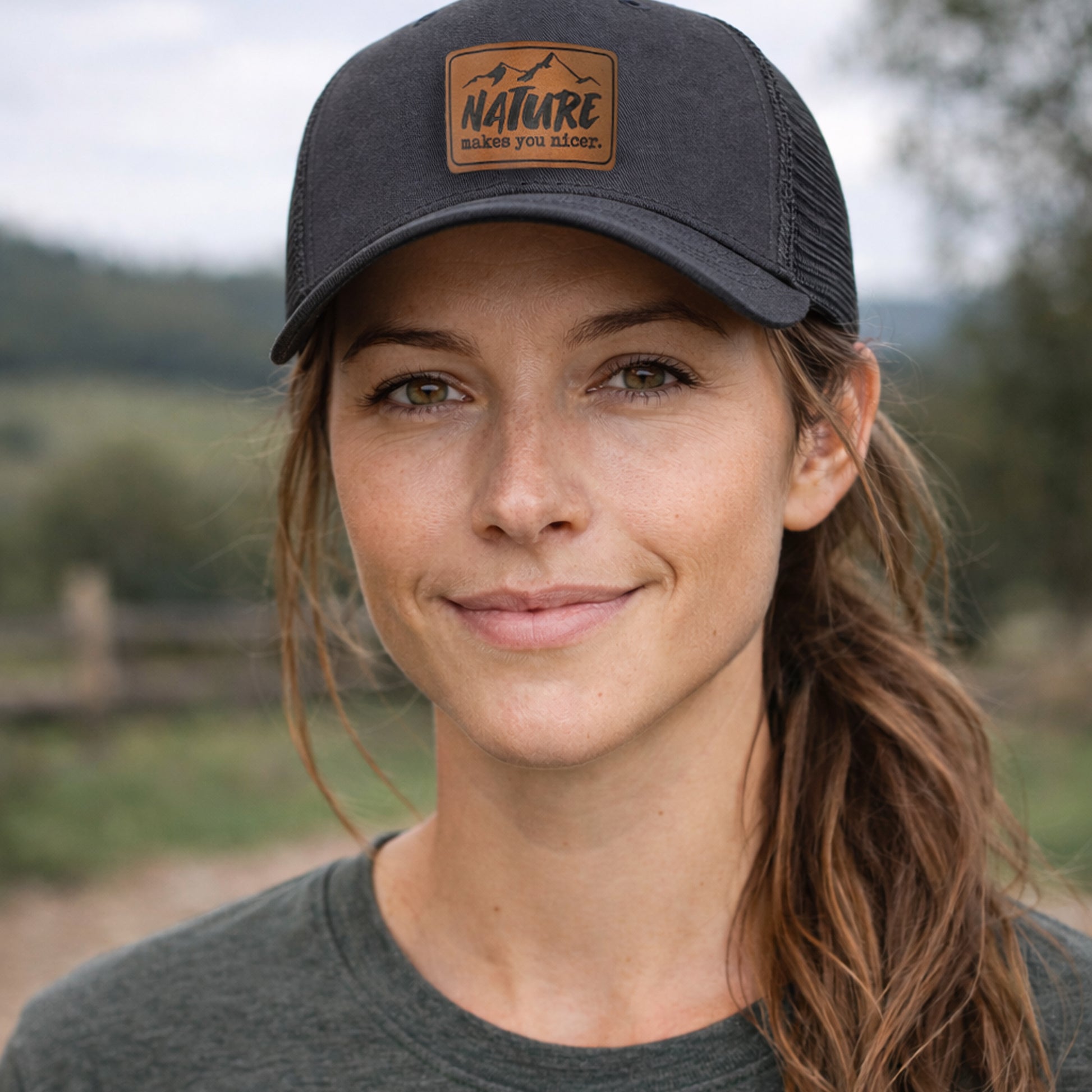 Our "Nature makes you nicer" Trucker Hat features the wording on a vegan leather patch—an easy-selling style for outdoor stores, hiking boutiques, and gift shoppers who love nature and the outdoor life. A great add-on for spring and summer, travel displays, and adventure-themed collections.