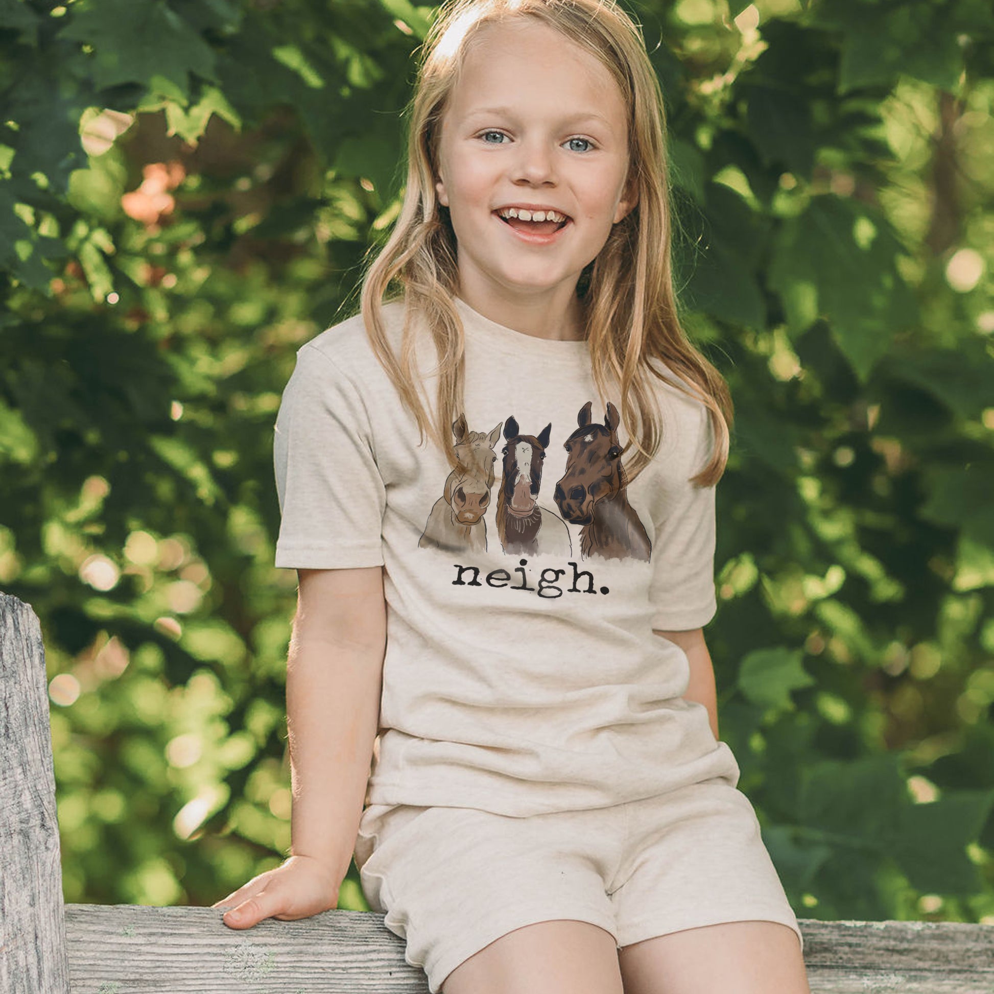 "Neigh" Realistic Three Horse Short Sleeve Shirt: Immerse your child in the world of equestrian wonder with our exclusive short sleeve shirt featuring a breathtakingly realistic horse design. This captivating artwork is sure to ignite their imagination and love for these magnificent creatures.