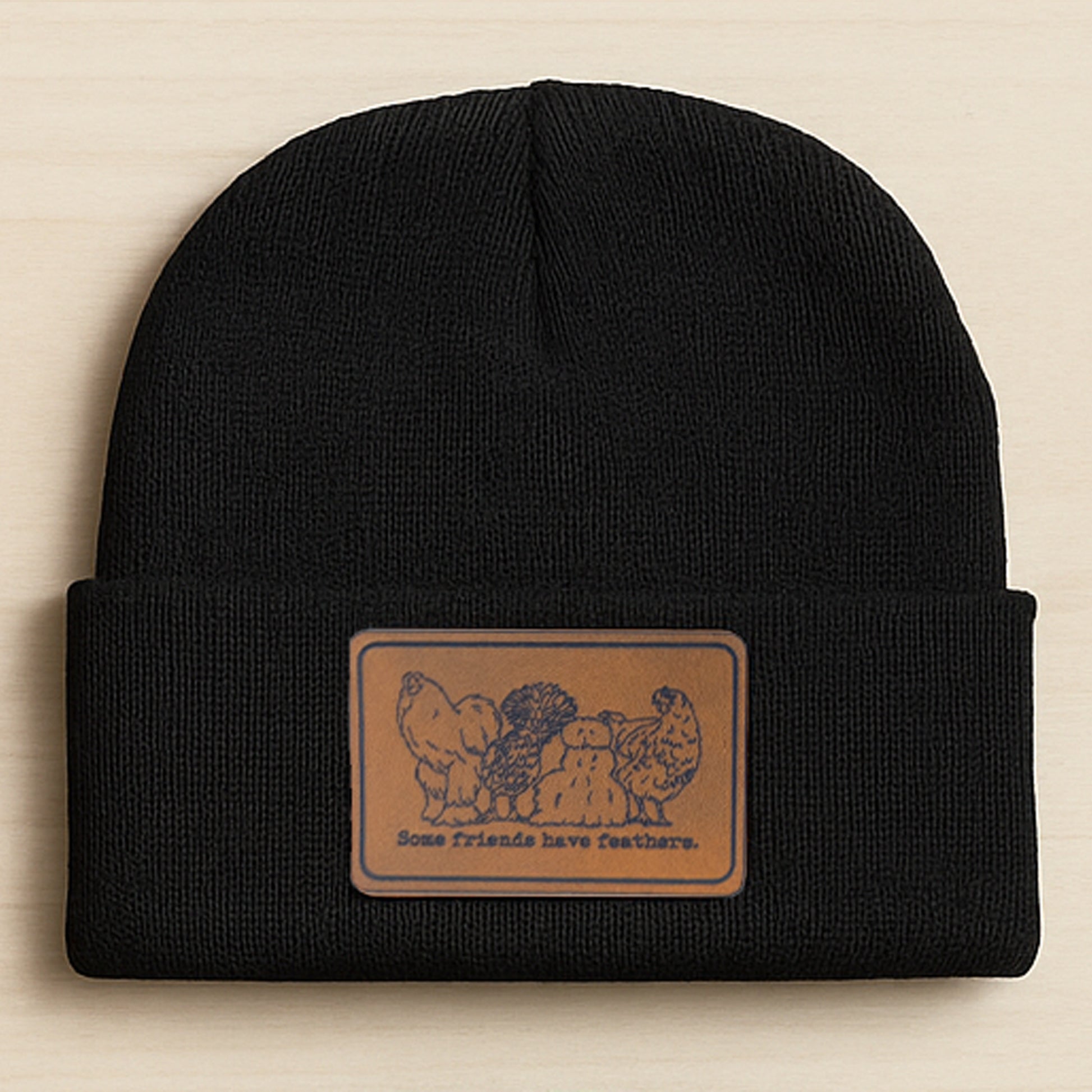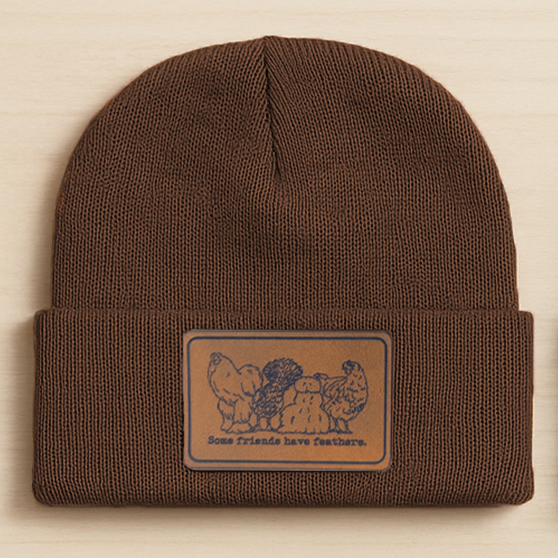 Making friends with your silly feathered sidekicks is something to be shared, and now you can spread that love in a stylish way! In pairing original artwork with a leather patch and a super soft beanie, this is perfect for all their days outside during the cooler seasons.